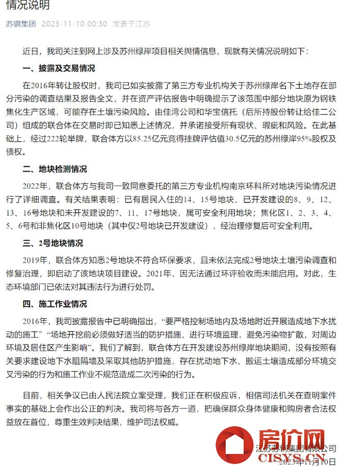 近日,有關“陸家嘴起訴蘇鋼集團索賠100億”消息引發社會廣泛關注。由于該案標的額超100億元,案件已直接由江蘇省高級人民法院立案受理,并由環資庭組成合議庭,將依法公開開庭審理。 據法治日報9日報道,蘇州高新區政府相關人士,對此提出了質疑,稱“該土地污染實際上并沒有媒體報道的那么嚴重,本質上還是房地產市場低迷引起的連鎖商業糾紛導致,政府會積極應對此次訴訟。” 11月10日,蘇鋼集團發布情況說明,稱其事先如實披露了地塊可能存在土壤污染風險;部分地塊經治理修復后可以使用;購買方未能依法完成2號地塊的修復治理,施工時沒有按照有關要求建設地下水阻隔墻及采取其他防護措施,存在擾動地下水、搬運土壤造成部分環境交叉污染的行為和施工作業不規范造成二次污染的行為。 蘇鋼集團發布情況說明: 事先已告知污染情況,買方未依法修復 蘇鋼集團發布的情況說明全文如下: 近日,我司關注到網上涉及蘇州綠岸項目相關輿情信息,現就有關情況說明如下: 一、披露及交易情況 在2016年轉讓股權時,我司已如實披露了第三方專業機構關于蘇州綠岸名下土地存在部分污染的調查結果及報告全文,并在資產評估報告中明確提示了該范圍中部分地塊原為鋼鐵焦化生產區域,可能存在土壤污染風險。由佳灣公司和華寶信托(后所持股份轉讓給佳二公司)組成的聯合體在交易時即已知悉上述情況,并承諾接受所有現狀、瑕疵和風險。在此基礎上,經過222輪舉牌,聯合體方以85.25億元競得掛牌評估值30.5億元的蘇州綠岸95%股權及債權。 二、地塊檢測情況 2022年,聯合體方與我司一致同意委托的第三方專業機構南京環科所對地塊污染情況進行了詳細調查。有關結果表明:已有居民入住的14、15號地塊、已開發建設的8、9、12、13、16號地塊和未開發建設的7、11、17號地塊,屬可安全利用地塊;焦化區1、2、3、4、5、6號和非焦化區10號地塊(其中僅2號地塊已開發建設),經治理修復后可安全利用。 三、2號地塊情況 2019年,聯合體方知悉2號地塊不符合環保要求,且未依法完成2號地塊土壤污染調查和修復治理,即啟動了該地塊項目建設。2021年,因無法通過環評驗收而未能啟用。對此,生態環境部門已依法對其違法行為進行處罰。 四、施工作業情況 2016年,我司披露報告中已明確指出,“要嚴格控制場地內及場地附近開展造成地下水擾動的施工”“場地開挖前必須做好適當的防護措施,進行環境監理,避免污染物擴散,對周邊環境及居住區產生影響”。我們了解到,聯合體方在開發建設蘇州綠岸地塊期間,沒有按照有關要求建設地下水阻隔墻及采取其他防護措施,存在擾動地下水、搬運土壤造成部分環境交叉污染的行為和施工作業不規范造成二次污染的行為。 目前,相關爭議已由人民法院立案受理,我們正在積極應訴,相信司法機關在查明案件事實的基礎上會作出公正的判決。我司將與各方一道,把確保群眾身體健康和購房者合法權益放在首位,尊重生效判決結果,維護司法權威。 11月4日陸家嘴集團發布公告:因土壤污染產生侵權糾紛,其下屬子公司將蘇鋼集團、蘇州市環境科學研究所、蘇州市蘇城環境科技有限責任公司、蘇州國家高新技術產業開發區管理委員會、蘇州市自然資源和規劃局等告上法庭,并于近日收到了江蘇省高級人民法院的書面案件受理通知書。 陸家嘴集團的主要訴求是向蘇鋼集團索償100.44億元。 公告稱:早在2016年上海陸家嘴金融貿易區開發股份有限公司指定兩控股子公司佳灣公司和佳二公司(通過信托計劃)組成聯合體在上海聯合產權交易所聯合競得蘇鋼集團掛牌出讓的綠岸公司95%股權,綠岸公司(蘇州綠岸房地產開發有限公司)名下的主要資產為位于蘇州高新區蘇通路北、蘇鋼路東的17塊土地使用權。 公告稱:2022年以來,公司及各方環境調查確定綠岸公司名下14塊土地存在污染,且污染面積和污染程度遠超蘇鋼集團掛牌出讓時所披露的污染情況。同時,公司委托專業機構核查發現,在案涉土地的調規變性及出讓過程中,各被告存在一系列違法違規、弄虛作假、不依法履職的侵權行為,共同導致了原告方受讓存在嚴重污染的案涉土地。 對此,陸家嘴請求判令蘇鋼集團向原告承擔賠償人民幣10,043,925,260.35元(后續發現或明確實際金額高于該金額時將增加訴訟請求或另案提起訴訟)的侵權責任。要求蘇州市環境科學研究所、蘇州市蘇城環境科技有限責任公司、蘇州國家高新技術產業開發區管理委員會、蘇州市自然資源和規劃局就上述訴訟請求承擔連帶責任。要求本案訴訟費由上述五被告承擔。公告顯示,蘇州綠岸房地產開發有限公司作為該案第三人參與訴訟。 “原價130萬的房子,98萬就能買了” 有居民稱周邊房價下跌 據大皖新聞,在綠岸房產開發的住宅項目中,最早建成并入住的是一處小區。探訪中,記者遇到了小區居民老陶(化名),他是外省人,兒子在蘇州工作。為了孩子讀書方便,前幾年他們家花近兩百萬在該小區買了一套80多平米的房子。去年,小區居民發現,附近有地塊掛上了存在污染風險的警告牌,這個消息很快傳開。去年,老陶還看到有人在小區圍墻外的土地上鉆洞,疑似在進行污染檢測。 老陶說,這兩天,他也看到了關于附近地塊存在污染的新聞報道,心里產生了擔憂。“到現在也沒人和我們說我們小區這塊地到底有沒有污染,人住在這里要不