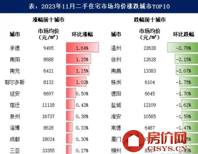 12月1日,諸葛數據研究中心發布2023年11月百城房價指數報告。11月100個重點城市二手住宅市場均價為15231元/平方米,環比下降0.62%,較上月跌幅擴大0.29個百分點,同比下降2.86%。至此,二手房市場均價連續9月下滑。未來成交量有望緩慢回升,但價格的恢復滯后于成交量,短期房價仍有一定的下行壓力。 上月百城二手房市場均價環比下降0.62% 據諸葛數據研究中心監測數據,11月100個重點城市二手住宅市場均價為15231元/平方米,環比下降0.62%,較上月跌幅擴大0.29個百分點,同比下降2.86%。至此,二手房市場均價連續9個月下滑。 雖然9月以來實質性政策逐步落地,包括認房不認貸、限購取消或放松,二手房成交量在政策的帶動下溫和改善,但二手房在掛牌量上升大于需求增速,房屋流動性不足,價格上漲仍動力不足,同環比均維持多月下滑的趨勢且11月降幅進一步擴大。近日央行發聲“房地產市場見底”,表明了高層對于房地產市場恢復的信心,未來成交量有望緩慢回升,但價格的恢復滯后于成交量,短期房價仍有一定的下行壓力。 各線城市二手房價環比均下跌 分城市等級來看,11月,與全國整體房價水平一致,各線城市房價均進一步下跌,具體來看,一線城市市場均價為61385元/平方米,環比下降0.47%,同比上漲5.1%。二線城市市場均價為18254元/平方米,環比下降0.79%,同比下跌4.34%。三四線城市市場均價為9505元/平方米,環比下降0.45%,同比下跌4.12%。 一線城市的房價較二線、三四線城市更為堅挺,僅一線城市同比為正。從環比上看,11月一線城市房價轉跌,四個一線城市中北上深房價均下跌,認房不認貸的政策效應正在減弱,市場入市情緒仍然不高,展望后市,仍需更大的政策支持,需謹剔市場價格持續下滑的壓力。 漲跌幅度前十均以三四線城市為主 從環比漲幅TOP10的城市來看,承德、南陽、南充房價漲幅位居前三,漲幅均低于1.8%,屬于房價的正常波動區間。淄博在燒烤城的帶動下,外來人口增加,年內房價有一定的漲幅,11月淄博房價為8626元/㎡,環比上漲0.33%,同比上漲3.7%。成都、三亞屬于二線城市中房價較穩,成都作為西南區域的核心城市,有一定的人口吸引力,房價較為堅挺,年內并未出現較大降幅。 從環比跌幅TOP10的城市情況來看,溫州、徐州、南昌位居跌幅TOP3,且跌幅均超2%;南昌近期房價下跌較為明顯,連續2月跌幅領跑。11月底廈門樓市邁入全面取消限購新階段,由于執行時間較短,暫且對價格影響暫時較弱,11月廈門房價為47236元/㎡,環比下降1.45%,位居跌幅TOP9。 |